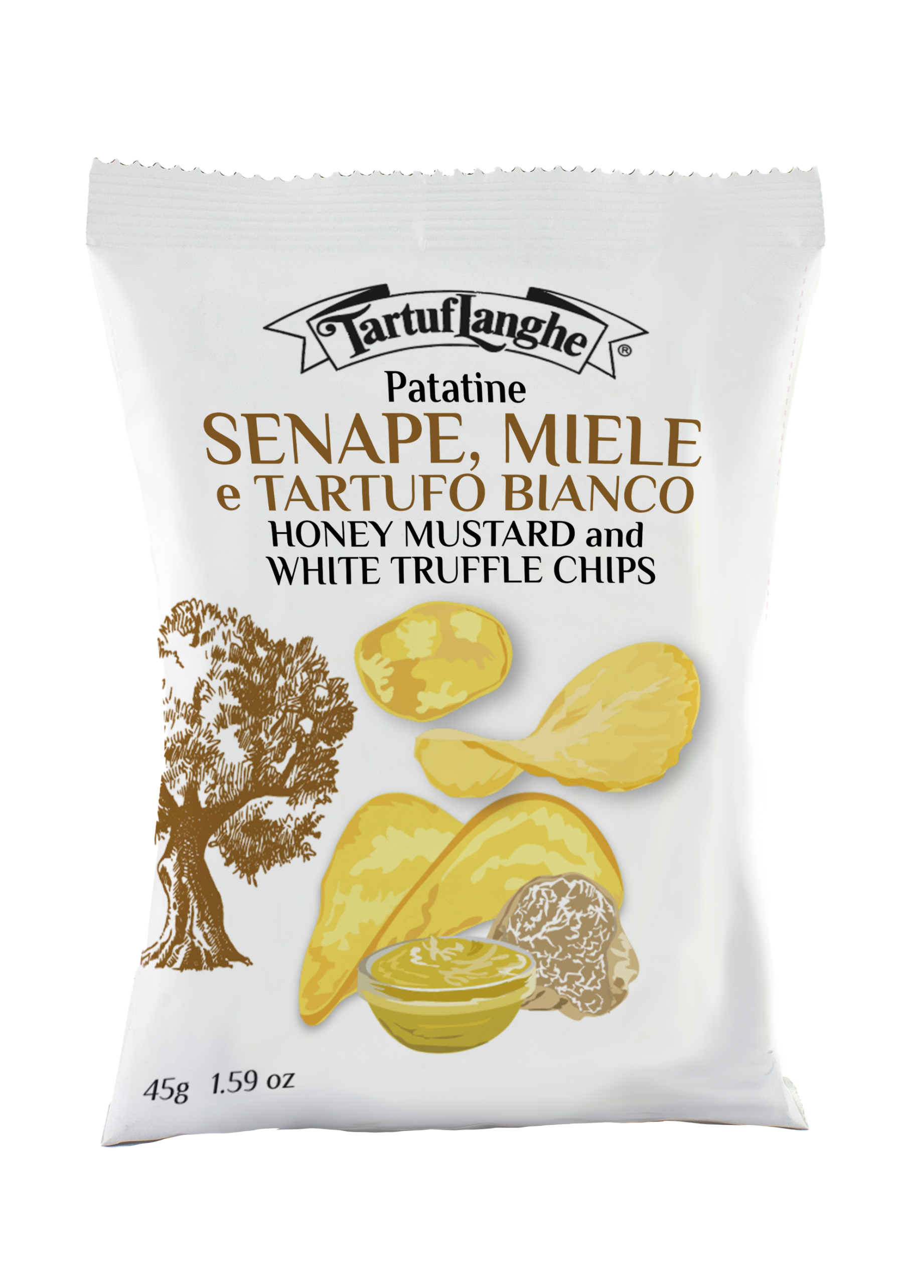 L’assaisonnement à la moutarde, au miel et à la truffe blanche est préparé en interne par Tartuflanghe et cryo-séché, ce qui permet de préserver la saveur des matières premières fraîches.